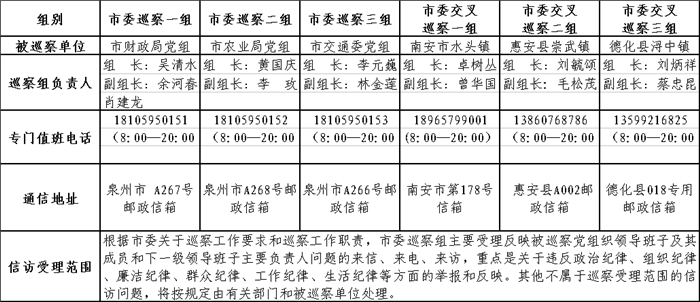 根据《中国共产党巡视工作条例》及中央、省委、市委关于巡察工作的部署要求,经市委巡察工作领导小组同意,从2018年8月中旬开始,开展十二届市委第五轮第四批巡察,被巡察单位为市财政局、农业局、交通委党组和南安市水头镇、惠安县崇武镇、德化县浔中镇,巡察时间一个月左右。日前,6个巡察组已进驻被巡察单位。