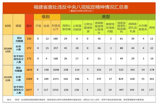 2018年10月,福建查处违反中央八项规定精神问题192件,处理272人,给予党纪政务处分172人。截至10月31日,福建查处违反中央八项规定精神情况如下: