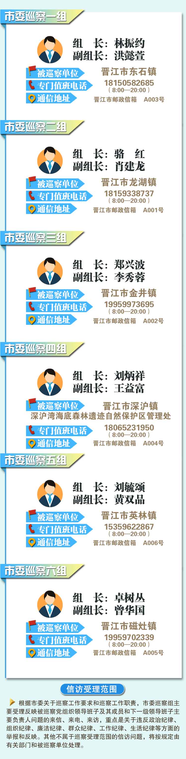 根据《中国共产党巡视工作条例》及中央、省委、市委关于巡察工作的部署要求,经市委巡察工作领导小组同意,从2019年2月下旬开始,开展十二届市委第七轮第一批巡察,被巡察单位为晋江市东石镇、晋江市龙湖镇、晋江市金井镇、晋江市深沪镇、深沪湾海底森林遗迹自然保护区管理处、晋江市英林镇、晋江市磁灶镇,巡察时间一个月左右。日前,6个巡察组已进驻被巡察单位。