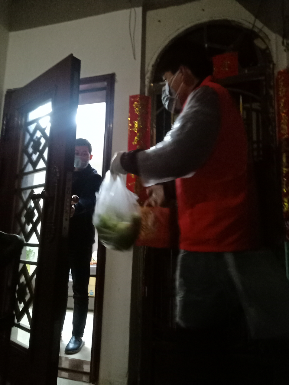 图为陈锡升为居家医学观察对象送去蔬菜、八宝粥等。