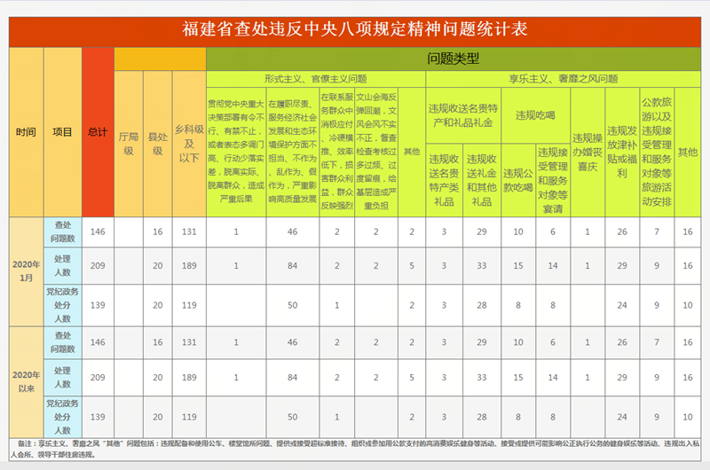 2020年1月,福建省查处违反中央八项规定精神问题146件,处理209人,给予党纪政务处分139人。福建省2020年以来查处违反中央八项规定精神情况如下: