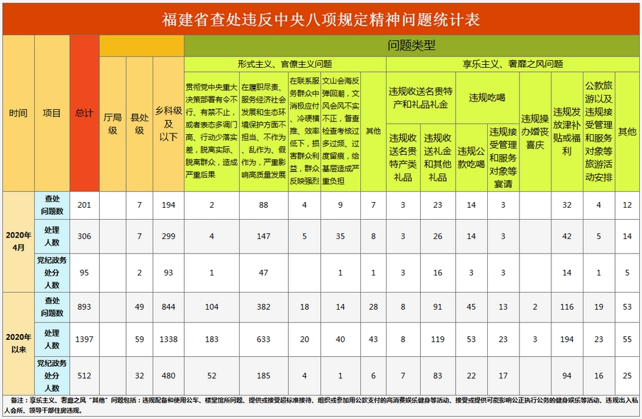 2020年4月,福建省查处违反中央八项规定精神问题201件,处理306人,给予党纪政务处分95人。福建省2020年以来查处违反中央八项规定精神情况如下: