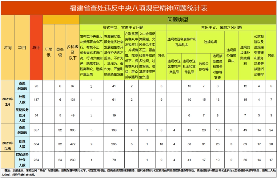 2021年2月,福建省查处违反中央八项规定精神问题93件,处理137人,给予党纪政务处分64人。福建省2021年以来查处违反中央八项规定精神情况如下: