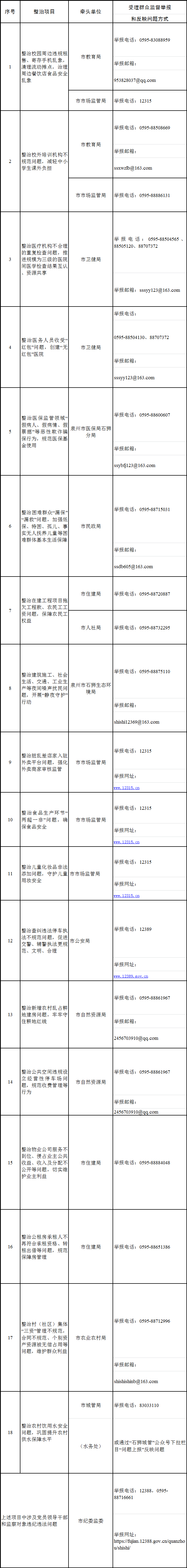 为深入贯彻落实十九届中央纪委五次全会、省纪委十届六次全会部署,石狮市纪委监委围绕党史学习教育“我为群众办实事”实践活动和市委“再学习、再调研、再落实”活动,按照“群众点题、部门答题、纪委监督、社会评价”总体思路,结合省、泉州市纪委公布的整治选课以及我市实际,决定在全市范围内对教育、医疗、食品药品安全等领域损害群众利益问题开展“点题整治”。为方便群众参与监督和反映问题,现将18个“点题整治”项目及受理群众监督举报方式公布如下: