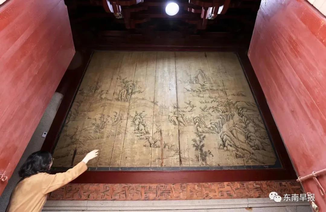 正殿后方,有一幅清道光年间(1821—1850年)绘制的大型壁画《敕封天上圣母图》,以写实的笔法描绘了当时湄洲岛天后宫的建筑格局,具有较高的历史与艺术价值。