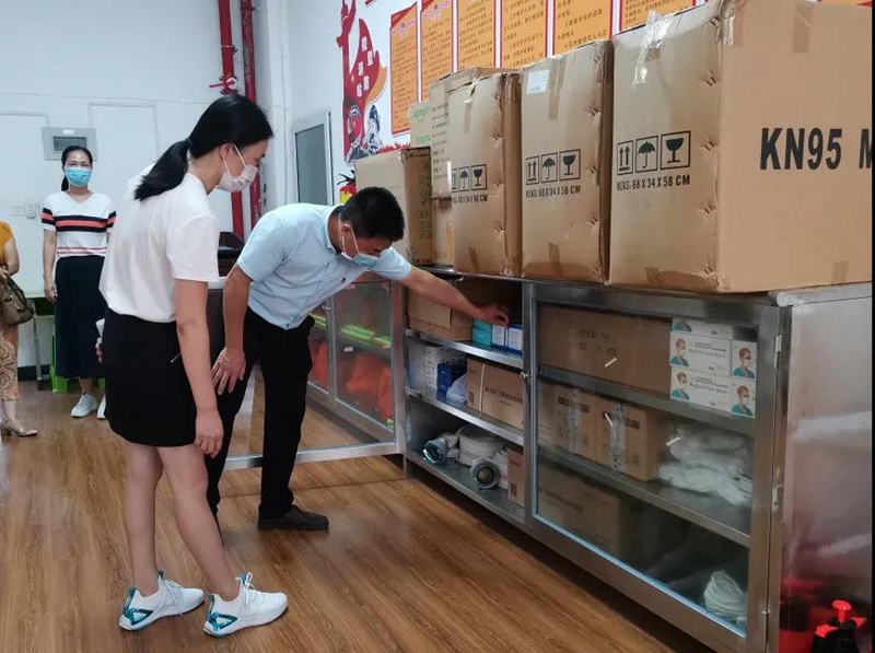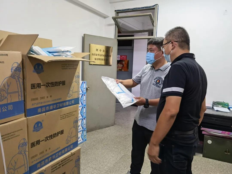 泉州市纪委监委第三纪检监察室干部到鲤城区开展疫情防控督导,图为督导人员在鲤中街道检查疫情防控物资储备等情况。(王芳 摄)