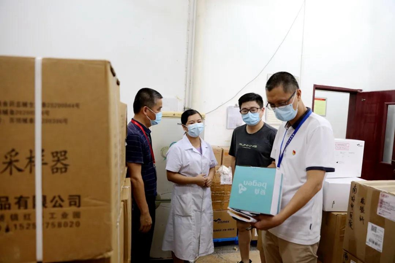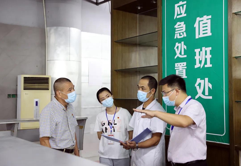 南安市纪委监委驻市卫健局纪检监察组干部在南安市中医院了解核酸检测采样物资储备等情况(黄文彪 摄)
