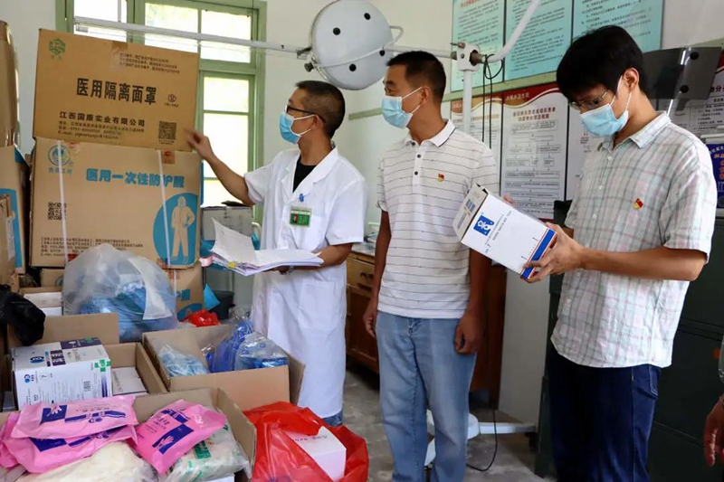 德化县大铭乡纪检监察干部到乡卫生院检查疫情防控物资储备、发热预分诊等落实情况。(林生泽 摄)