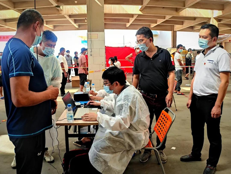 石狮市鸿山镇纪检监察干部到核酸检测现场,重点就现场疫情防控措施落实和渔民信息登记、核酸检测采样等情况开展监督检查。(侯振威 摄)