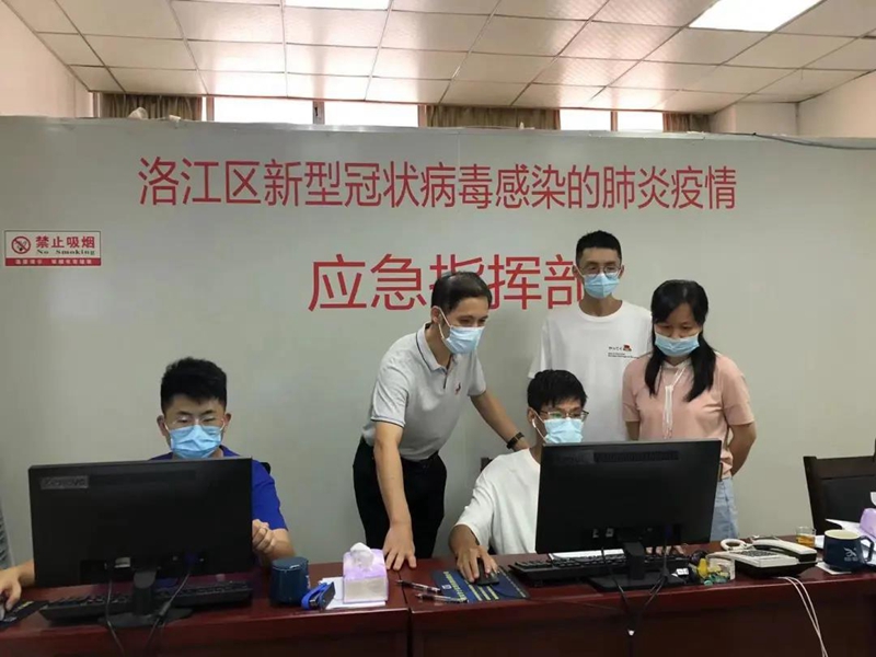 洛江区纪委监委干部到区疫情防控应急指挥部了解疫情情况,商讨督导方案。(林小莉 摄)