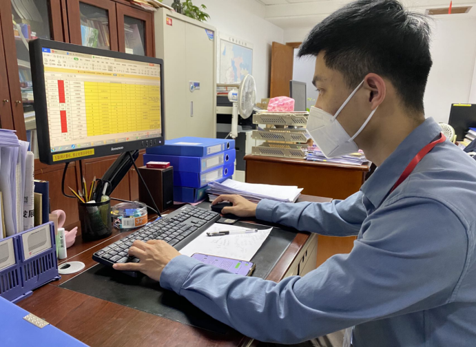 图为陈炜民正逐条筛查信息,进行流调数据分析比对。