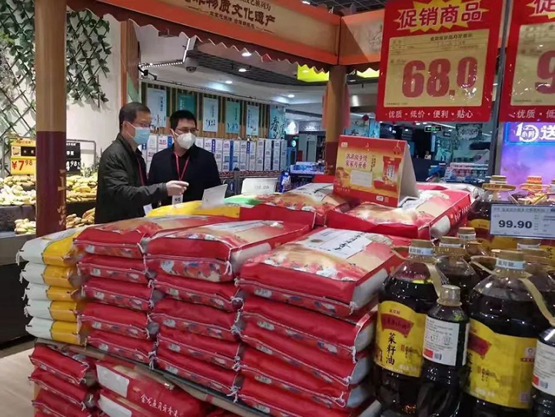 刘永辉(右一)实地走访大型商超、农贸市场,督导疫情防控落实情况。(许惊鸿 摄)