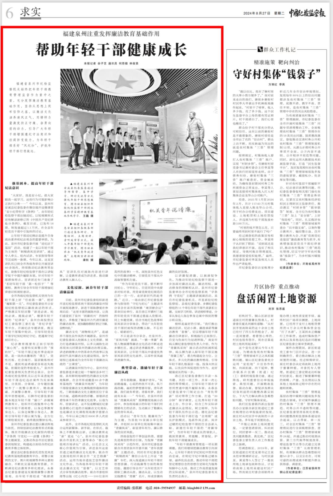 8月27日《中国纪检监察报》求实栏目大篇幅报道了福建泉州注重发挥廉洁教育基础作用 帮助年轻干部健康成长的经验做法