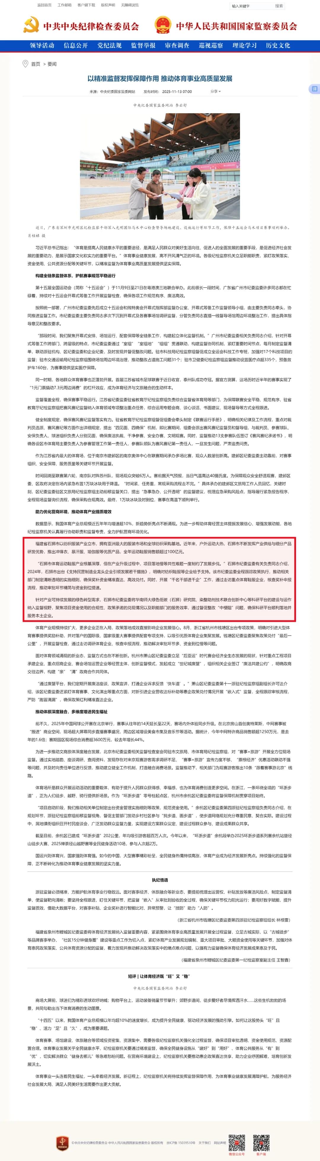11月13日中央纪委国家监委网站、中国纪检监察报报道《以精准监督发挥保障作用 推动体育事业高质量发展》其中提及石狮经验做法