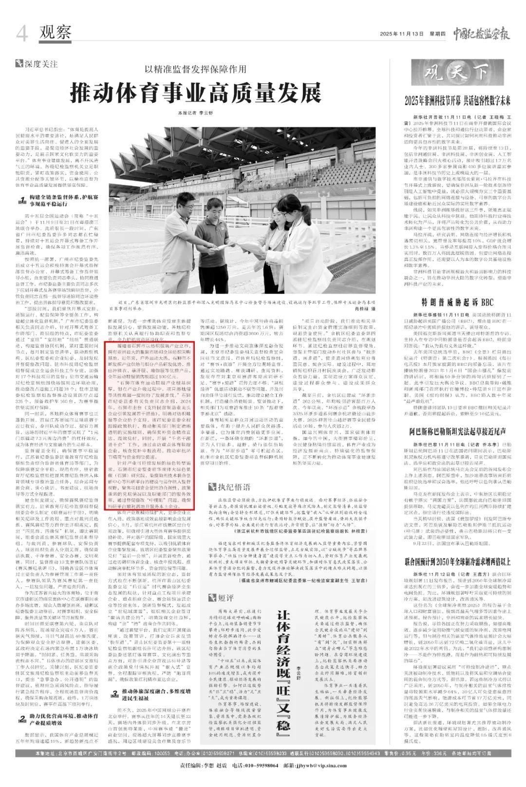 国运兴则体育兴,国家强则体育强。如今的中国,大型赛事精彩纷呈,全民健身热情持续高涨,体育产业成为经济发展新亮点。持续强化的监督保障,正不断转化为推动体育事业健康发展的坚实力量。